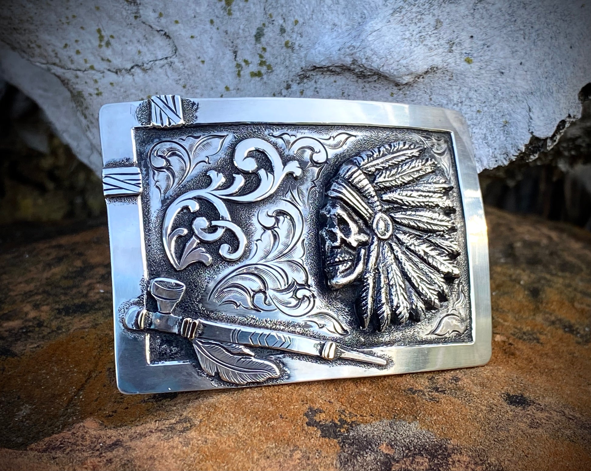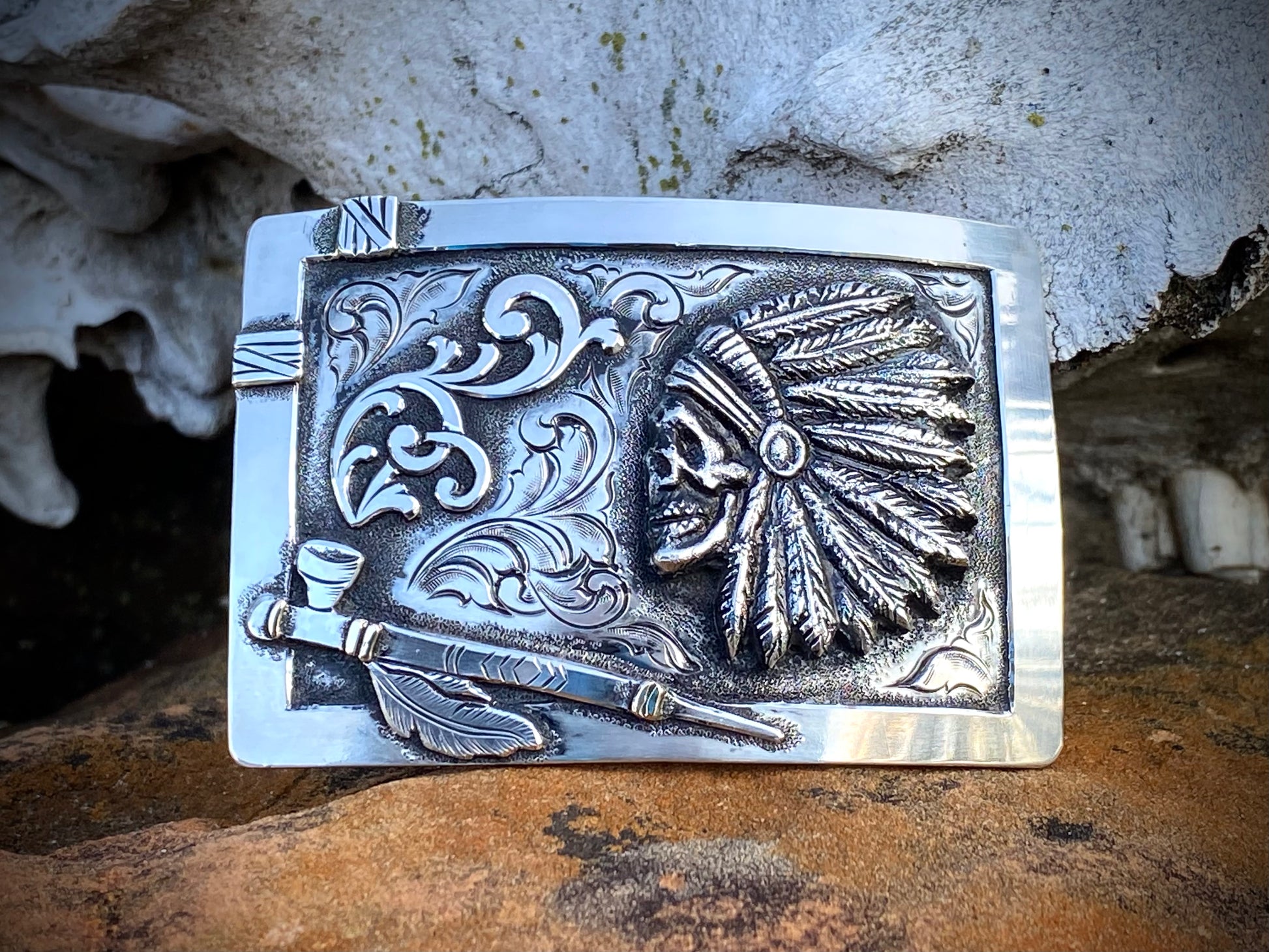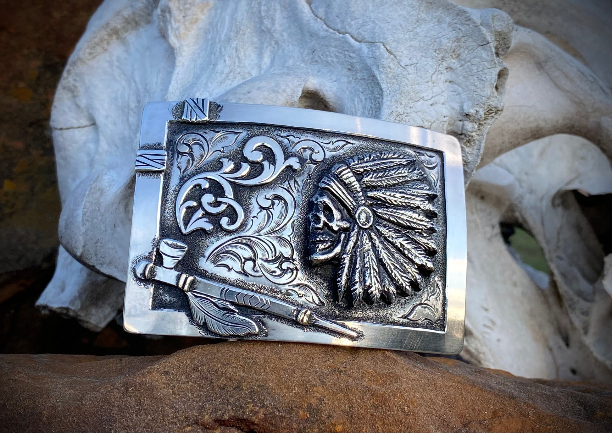 Indian Skull is a sterling cast that was made off a hand carved wax figure.