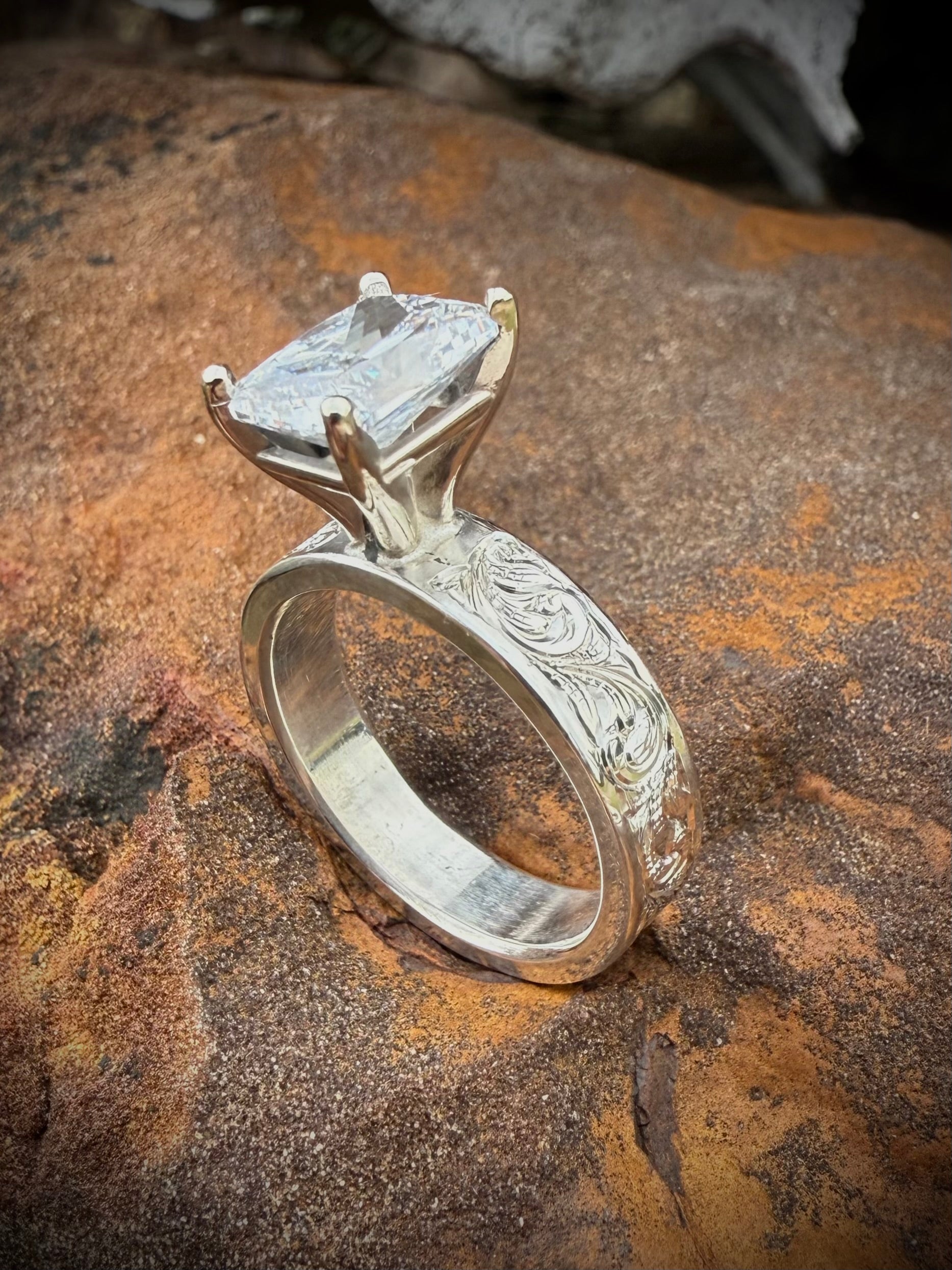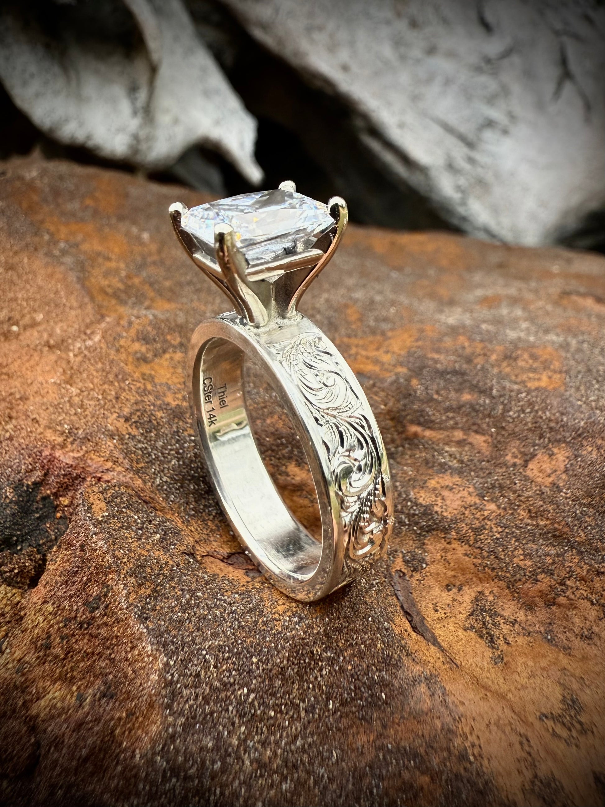7x9 mm radiant shape CZ (Cubic Zirkonia - diamond imitate) in 14k whitegold setting.
