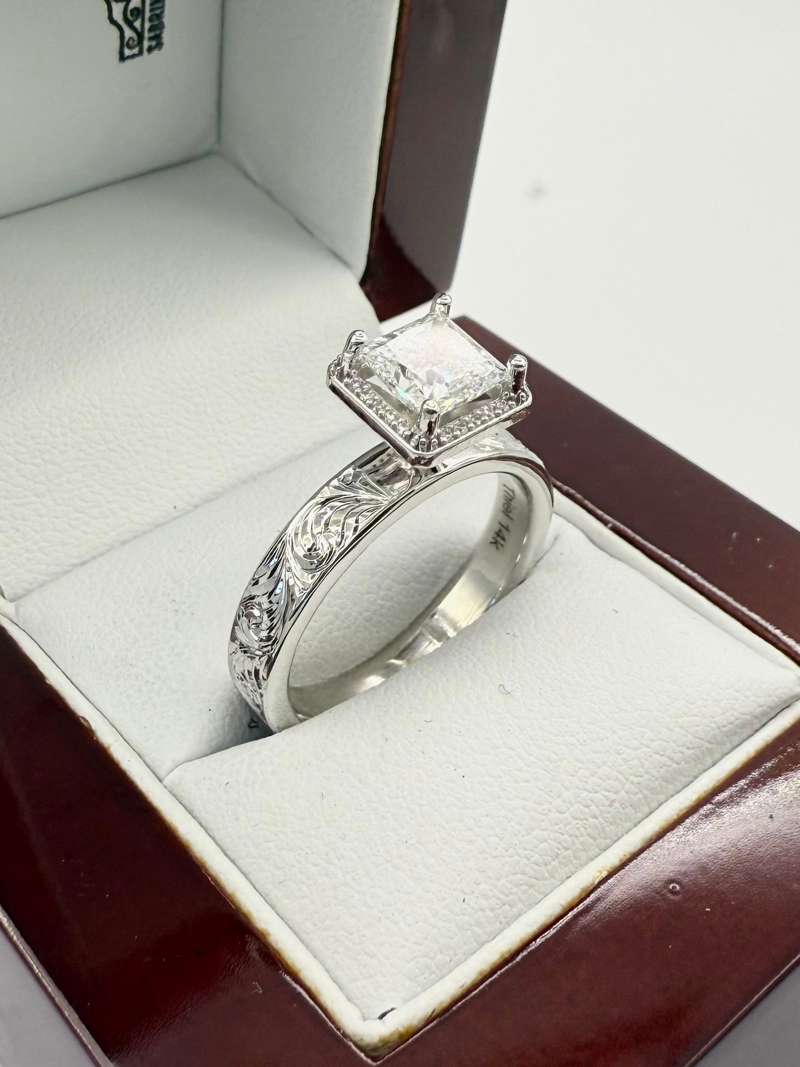 Luminesce engraved and rhodium plated for bright white finish. Scrolls and sunflowers.