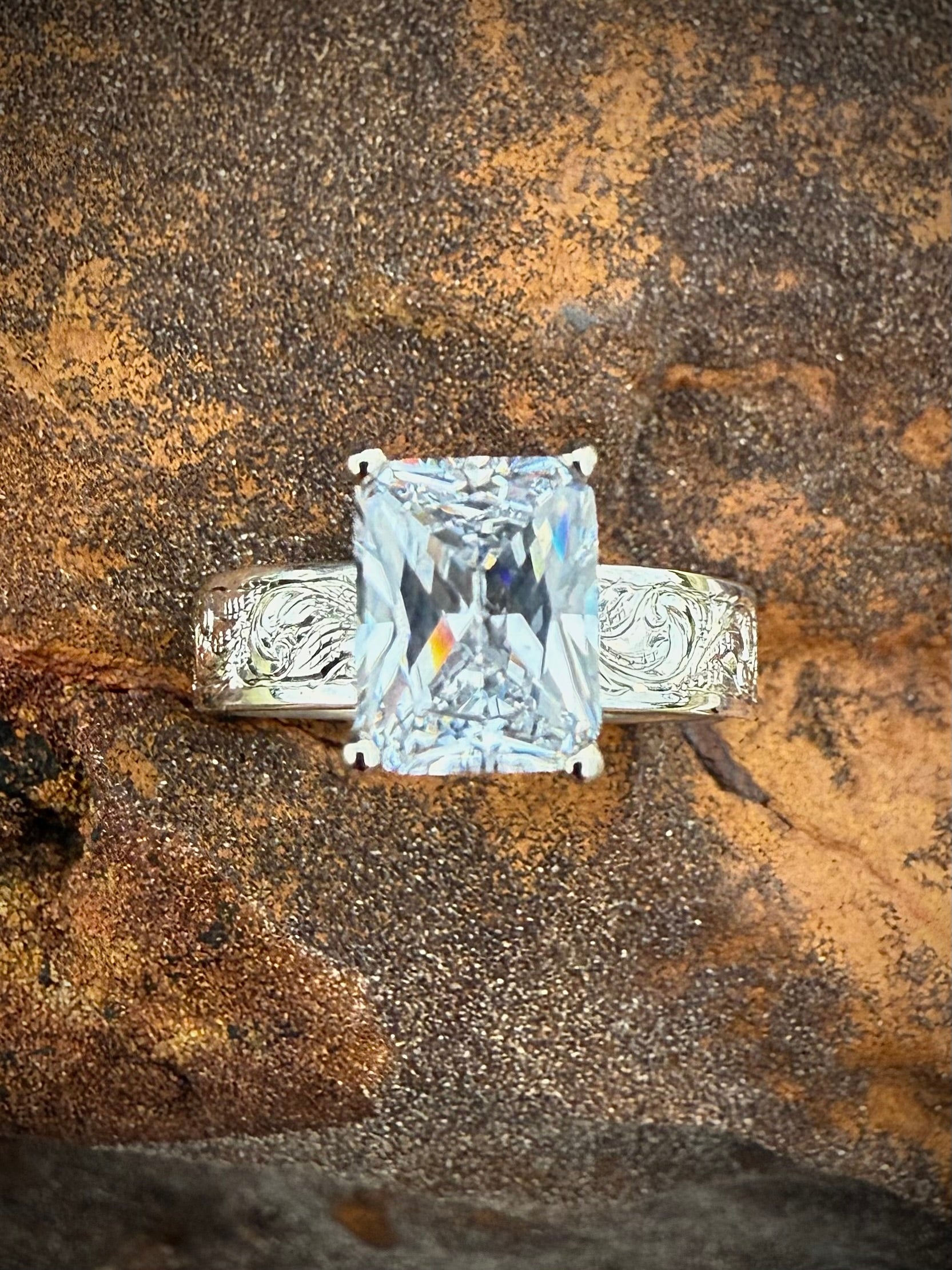 7x9 mm radiant shape CZ (Cubic Zirkonia - diamond imitate) in 14k whitegold setting.