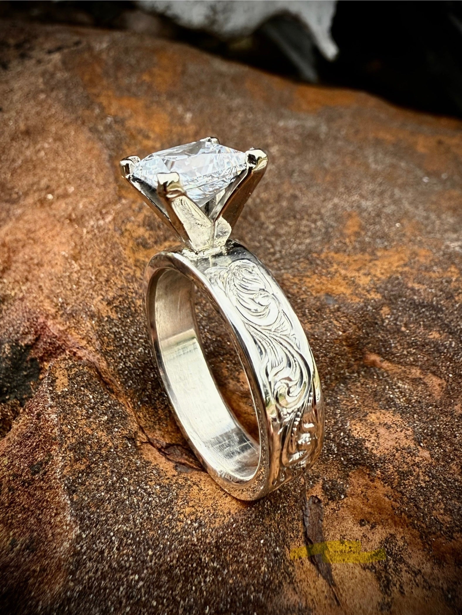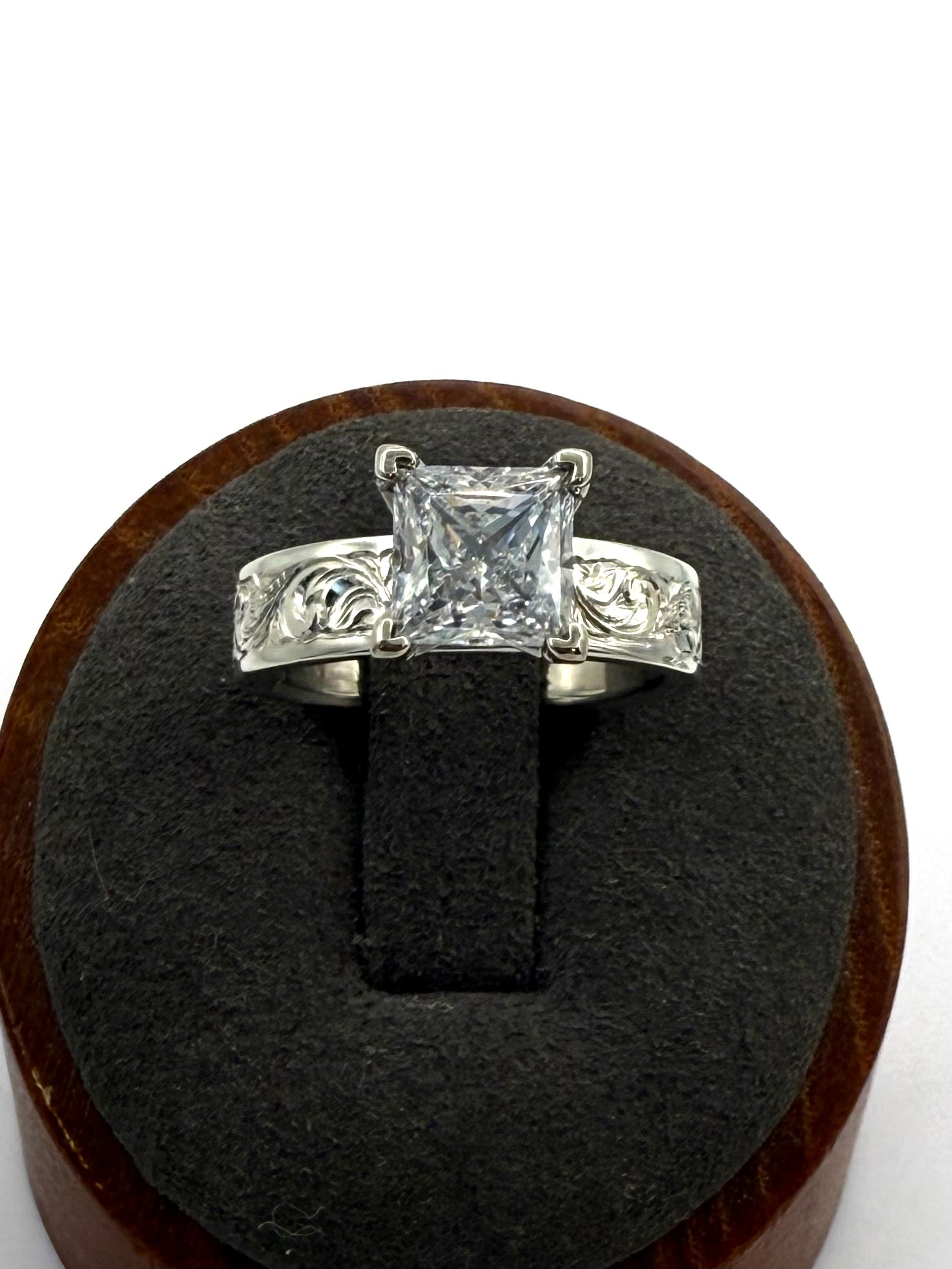 5mm wide Continuum Sterling Silver band shiny engraved without background antique. 7 mm princess shape CZ (Cubic Zirkonia - diamond imitate) in 14k whitegold setting.
