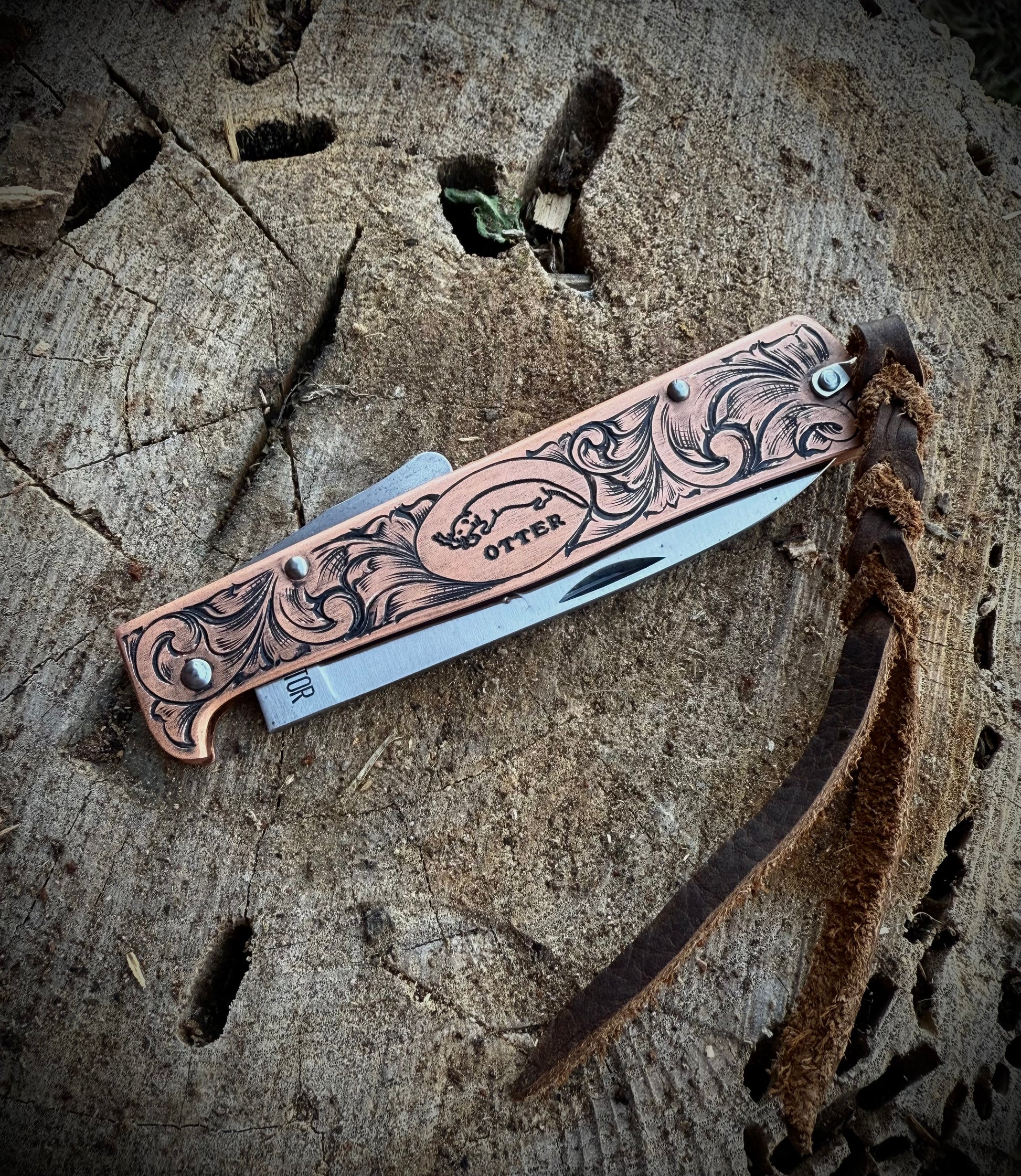 The Mercator is a traditional German pocket knife. With this new copper handle we gave it a new and exclusive look. Although the slim handle and classic blade were not changed. The embossed OTTER logo completes the extraordinary appearance of this knife. The Mercator copper is available with either a carbon or a stainless steel blade. The knife is also equipped with a leather strap to secure it against loss. This is the larger, lockable model. Please note: Since copper is a very soft material, small toolmarks from the manufacturing are hard to avoid. These are not defects, but rather witness to the individuality of the knife.