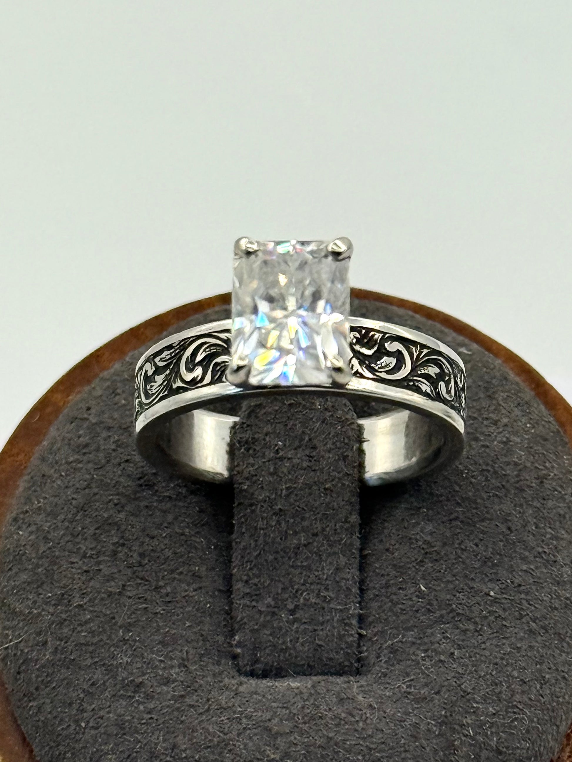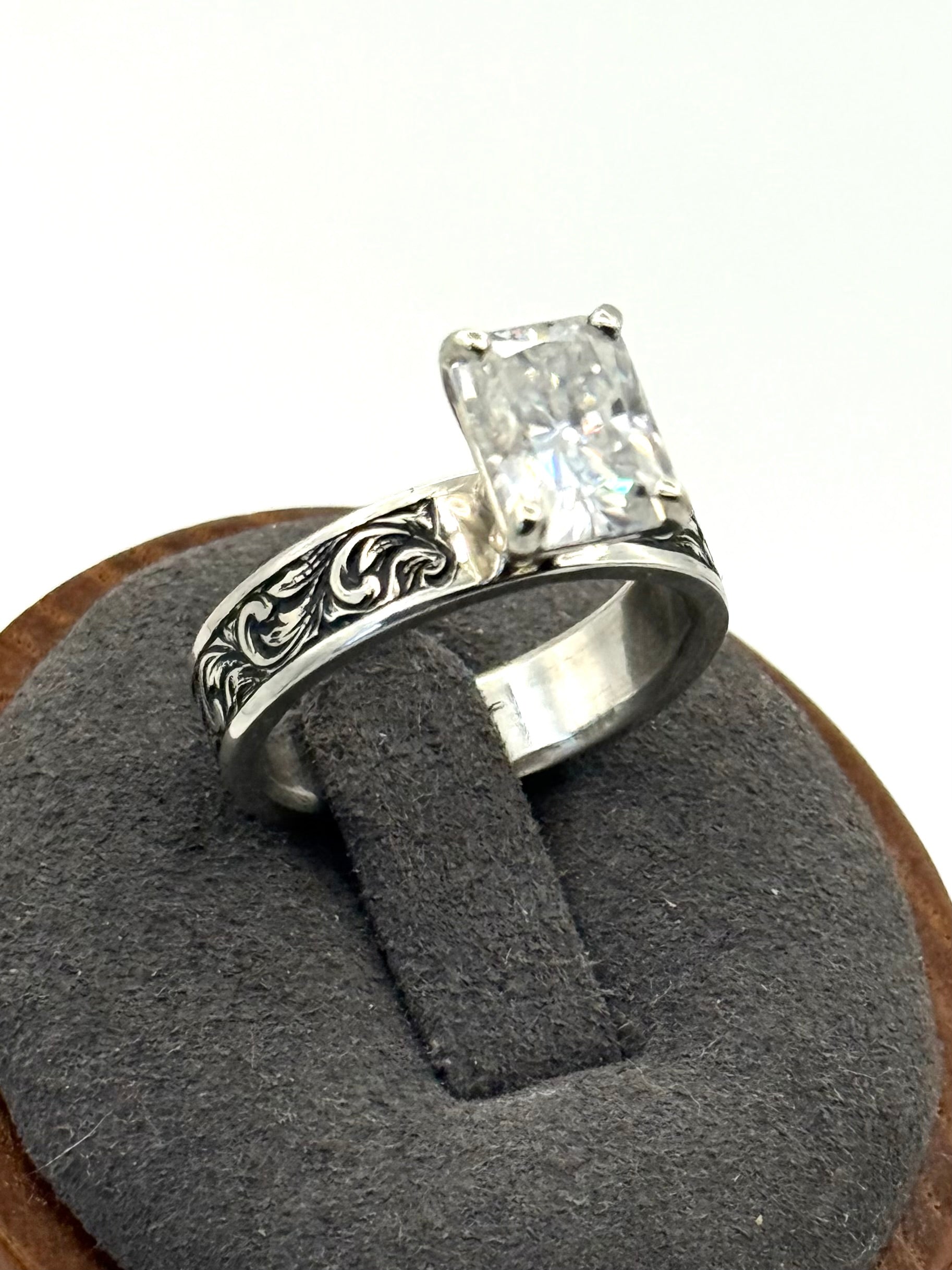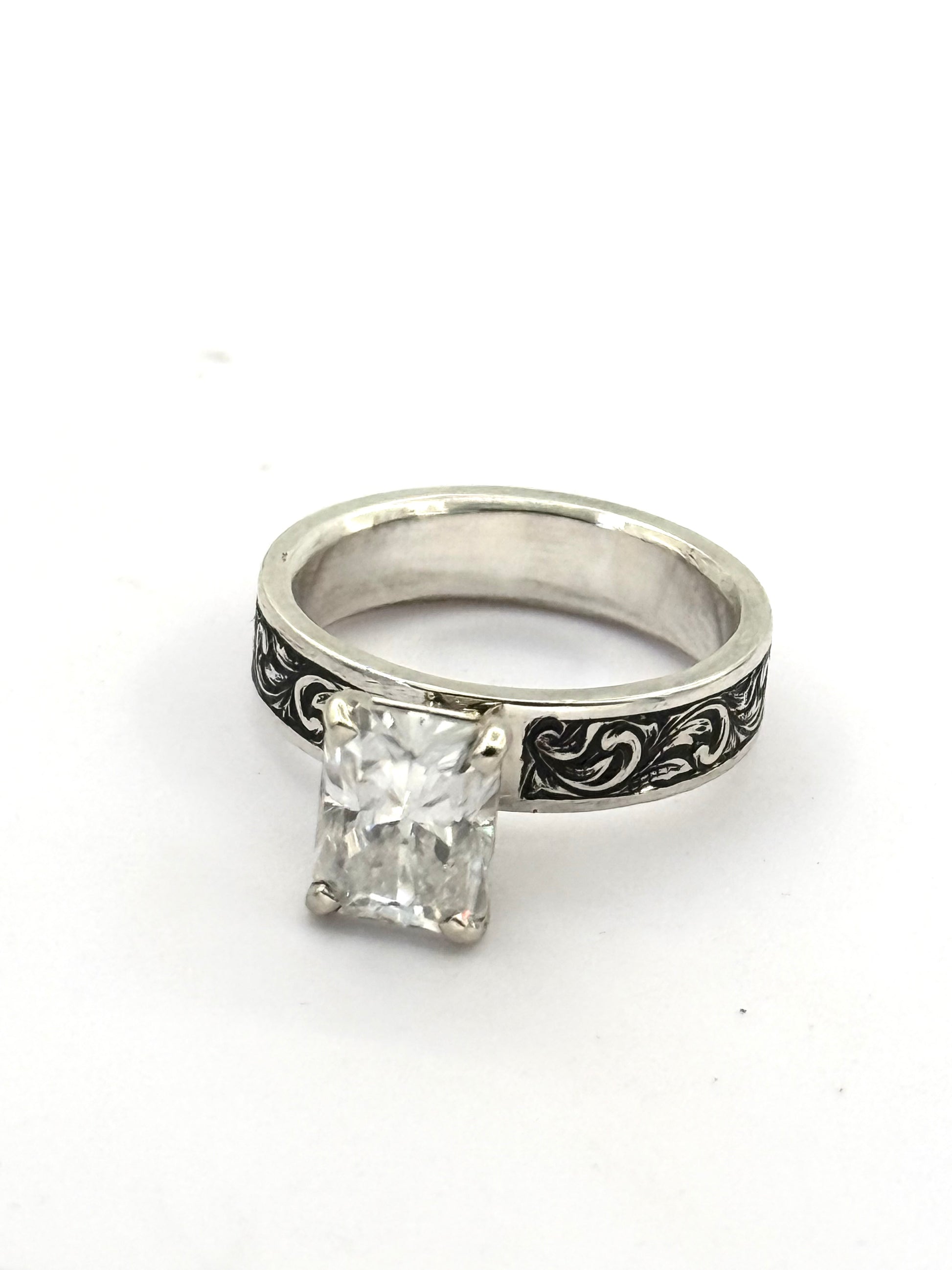 5mm Continuum Sterling Silver Band with 9x7mm (2.5 ct) Radiant cut Moissanite in 14k whitegold setting.