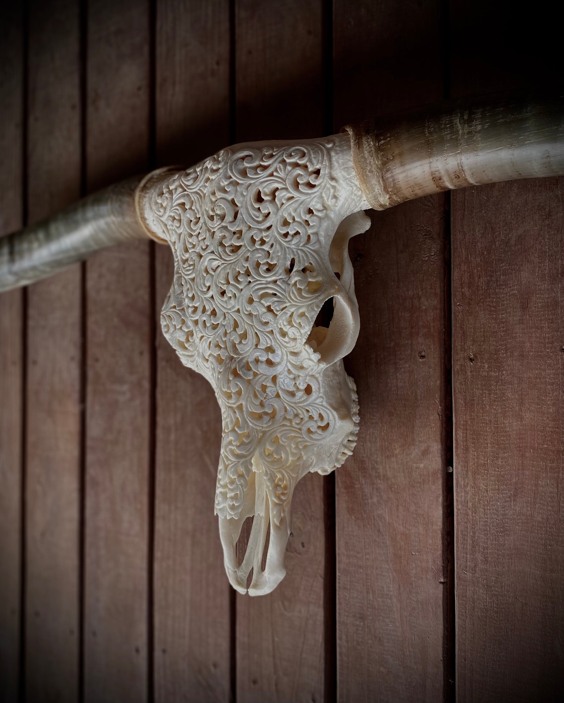 The skull has been professionally cleaned by a taxidermist prior to the hand carving.
