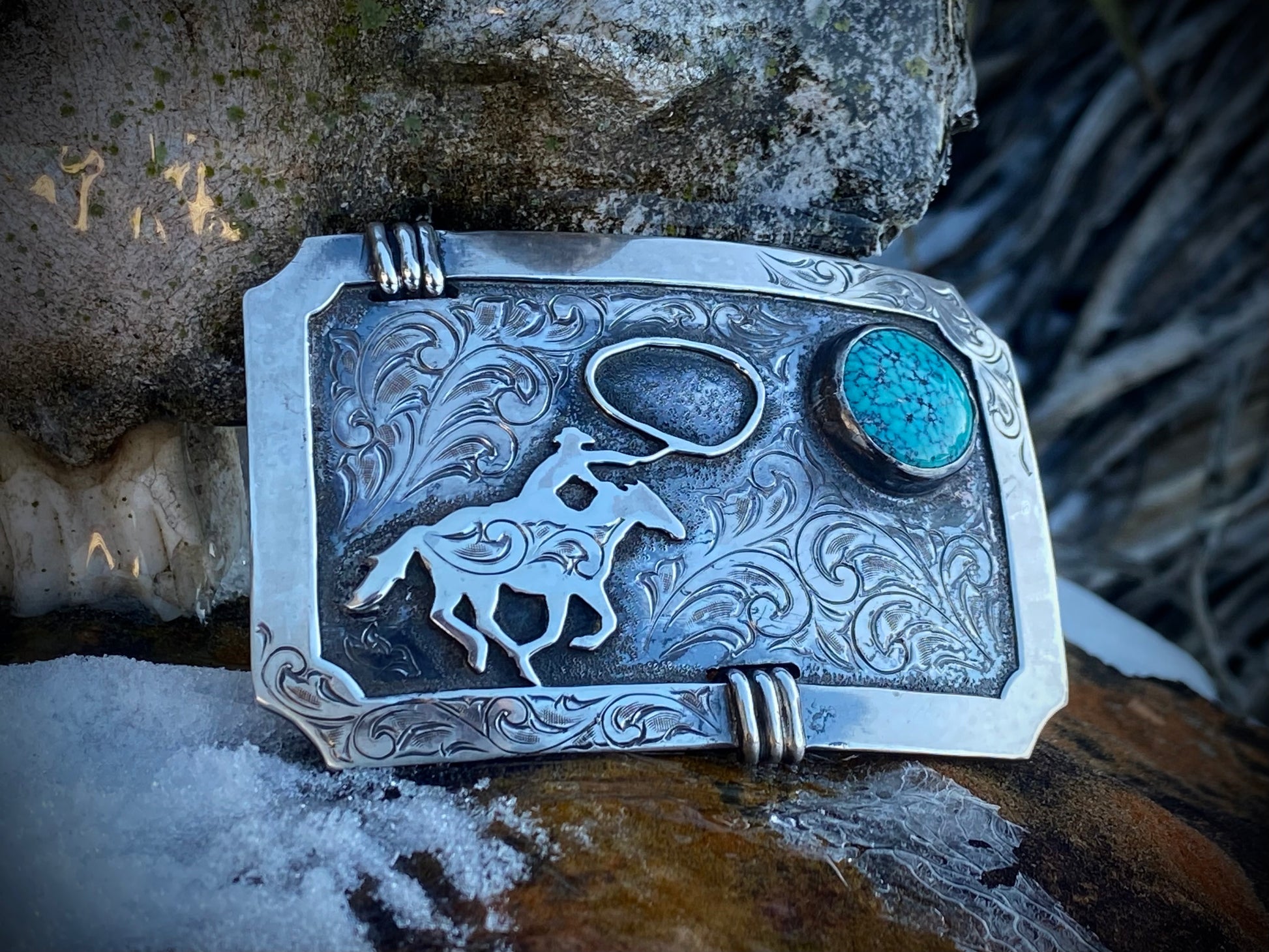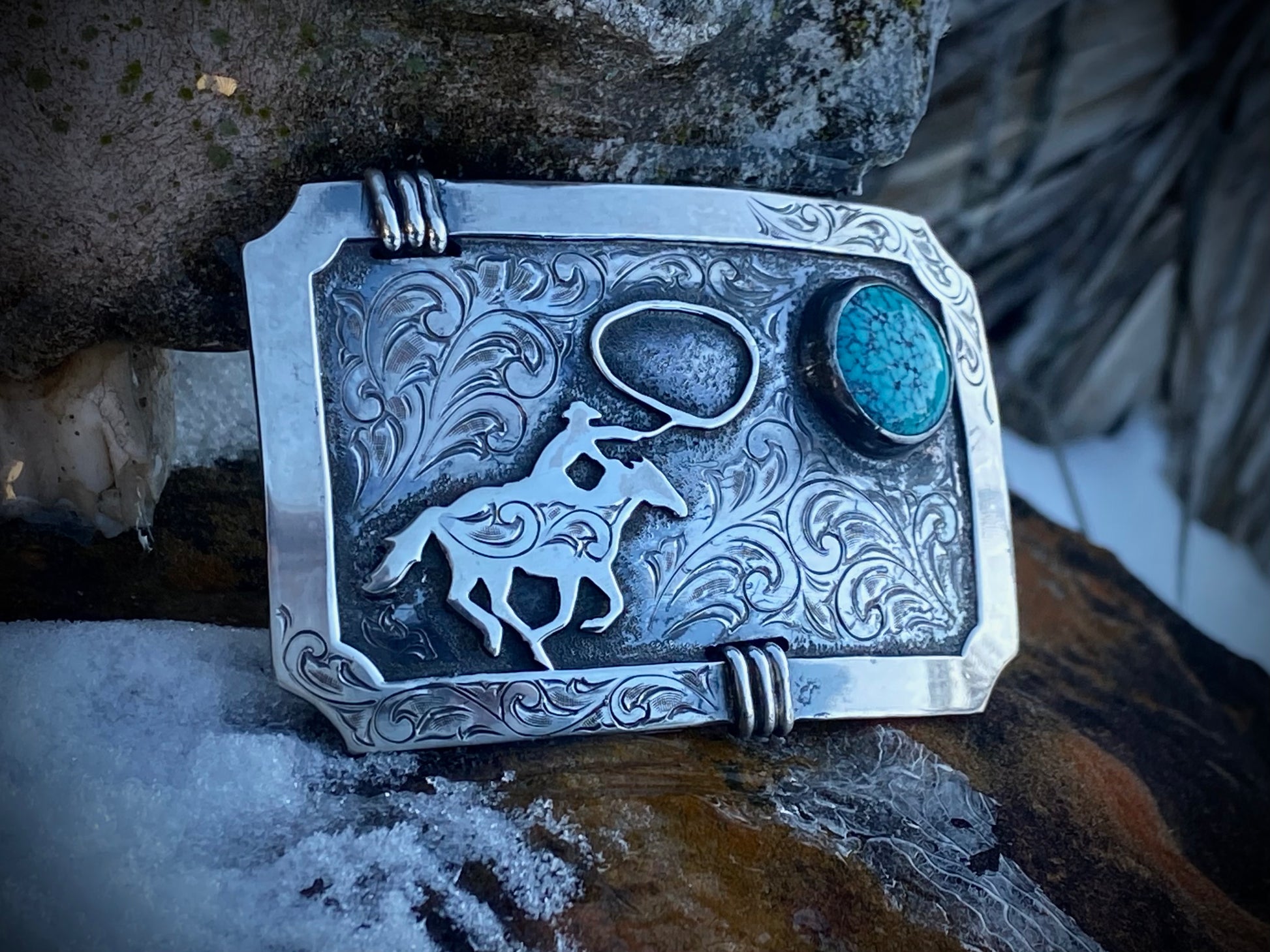 for 1.5" belts; solid 925 Sterling 3 1/2 x 2 1/4; Kingman Turquoise
