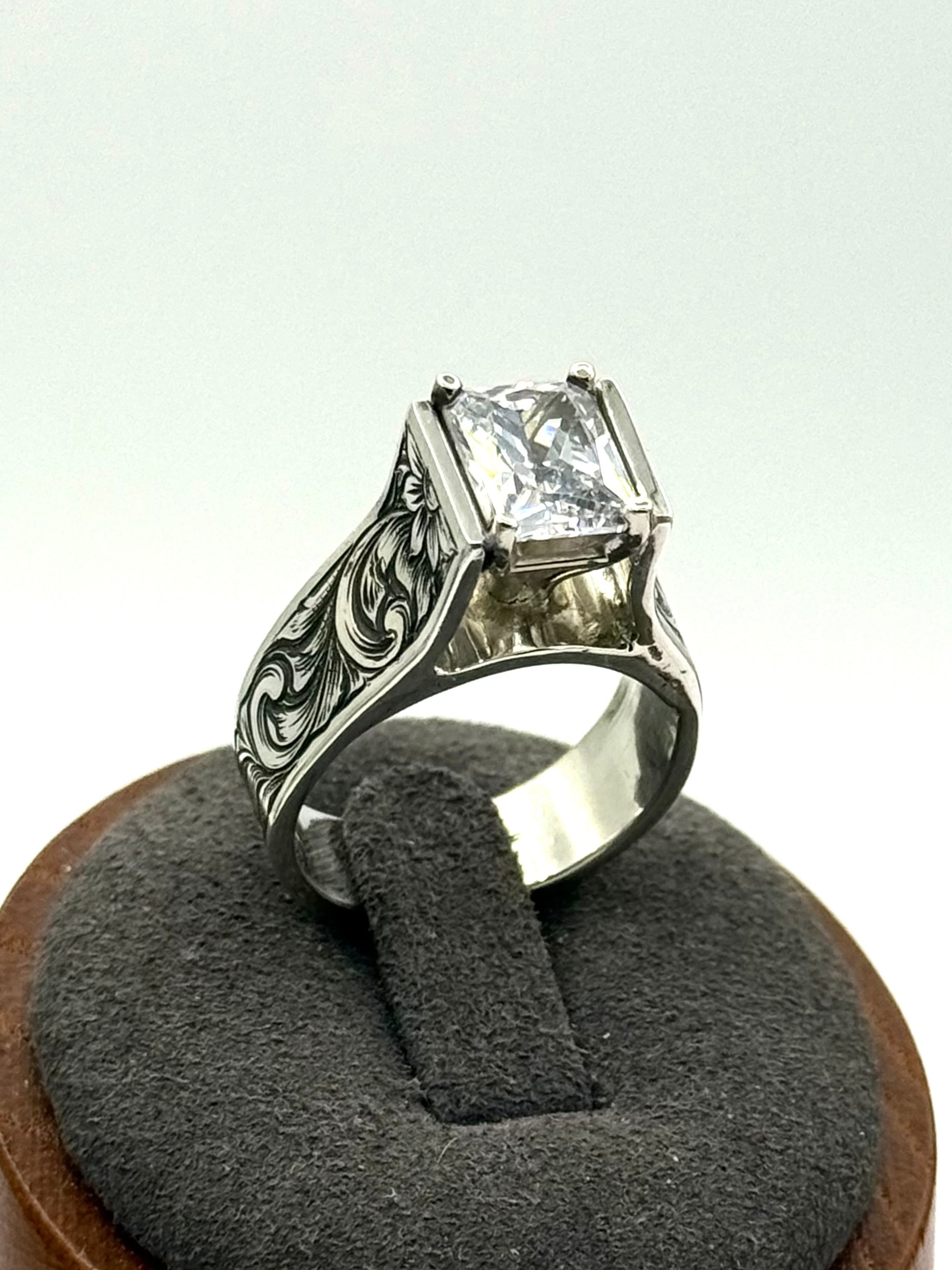 Center stone is a 7x9 mm radiant cut CZ (Cubic Zirkonia - diamond imitate).