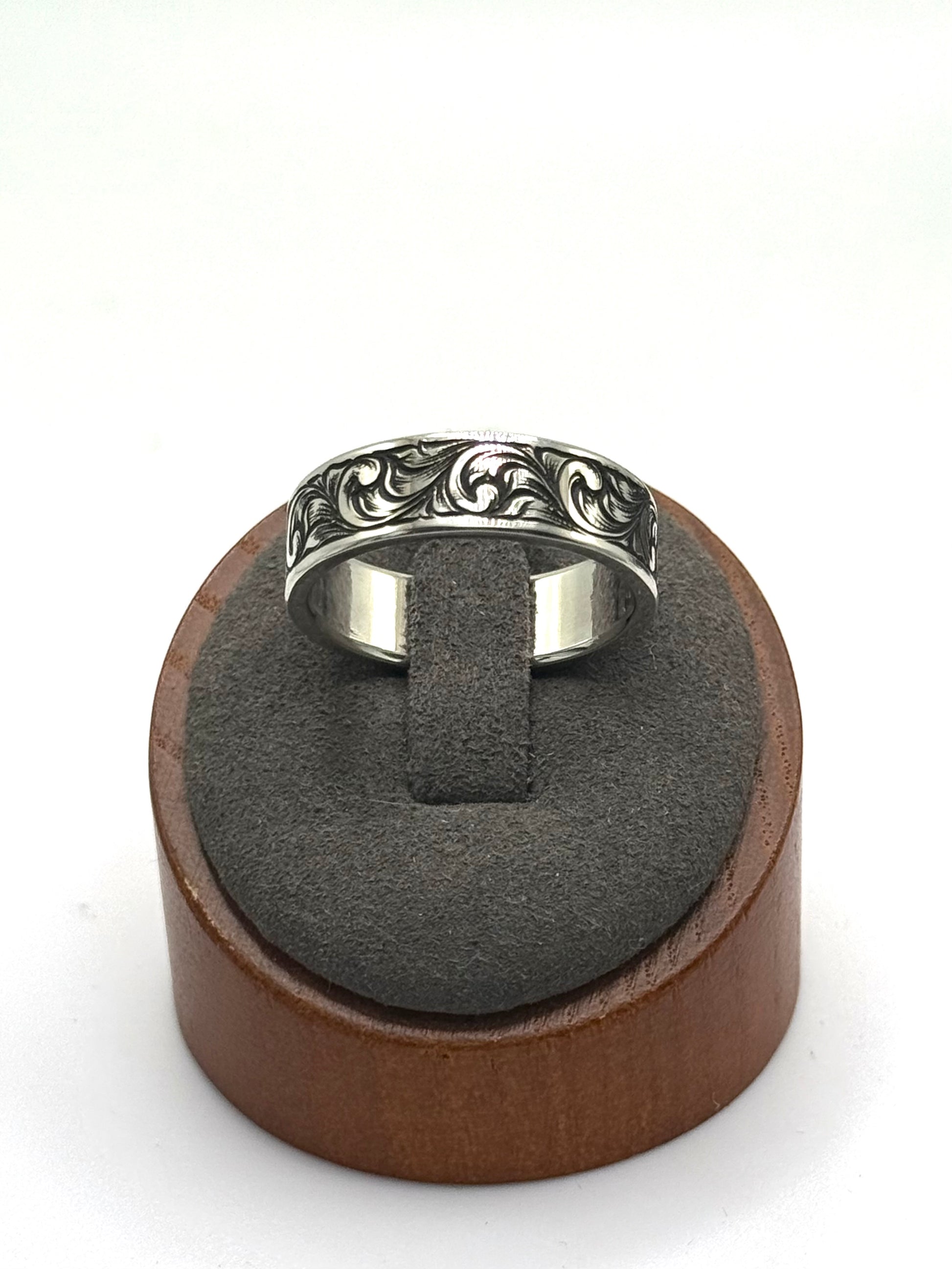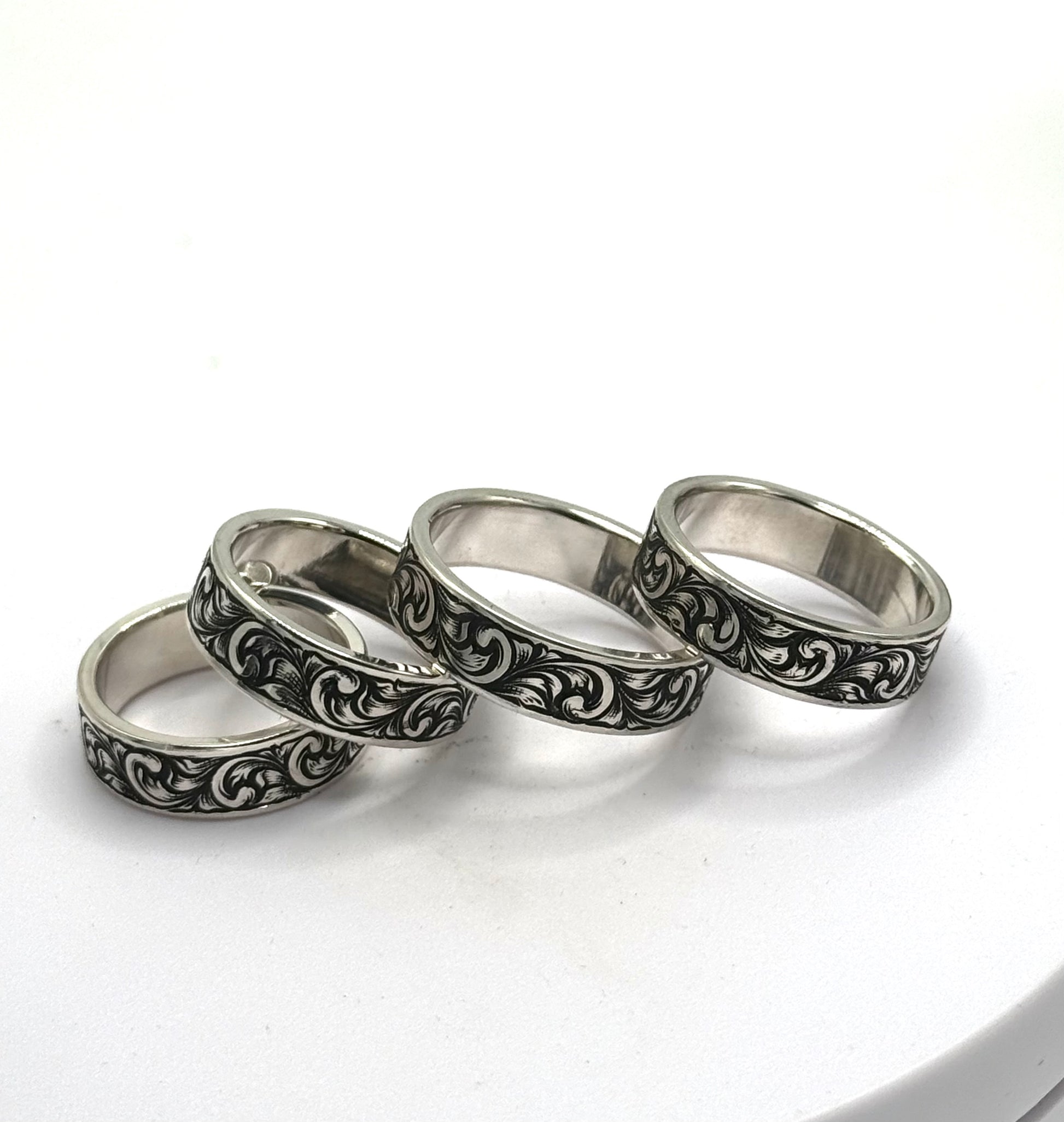 Hand engraved and antiqued Continuum Sterling Silver wedding bands.